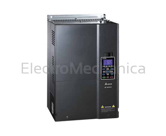 C2000 series – high performance FOC (field oriented control) AC motor drive C2000 series drives utilise FOC control as the core technology to fulfil high starting torque requirements and accurate speed and torque control, they offer PID adjustment, with simple operation interface. Synchronous position control Speed / torque / position control mode Outstanding 4-quadrant torque control / limit Intelligent PLC function (10k steps, 19 points: 10DI/4DO – 3AI/2AO) Modular design for ease of maintenance with many expansion extensions Improved Sensorless Vector Control (SVC) and torque control for crane applications High-speed communication interface with built-in CANopen and MODBUS communication SERIES C2000 MOTOR RATING 55.0kW VOLTAGE 380 – 460 VAC PHASE Three phase DESCRIPTION 3 phase AC motor drive FRAME SIZE D1 DIMENSIONS (MM) (H)550 x (W)330 x (D)275